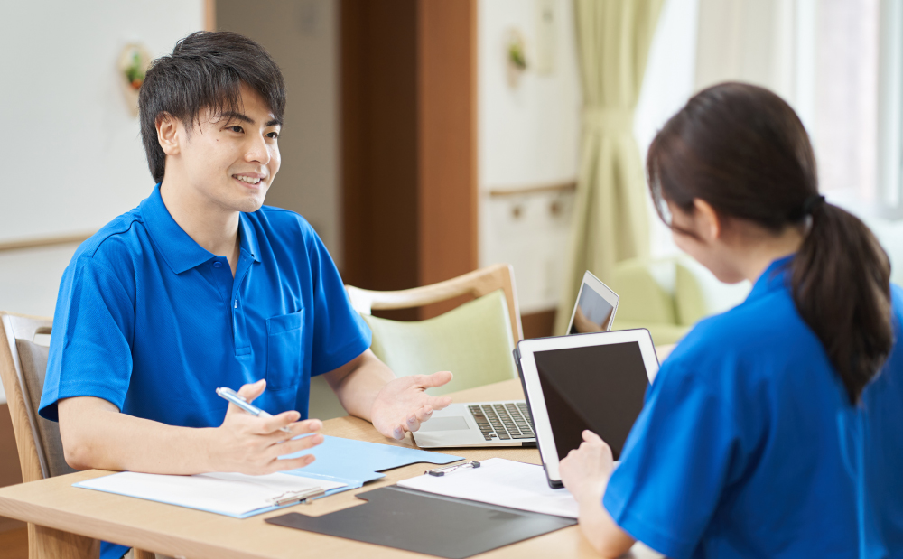 サービス内容の記録やスタッフ間での情報共有のための日報記入や申し送りを行います(スマホ操作レベルでOK)。